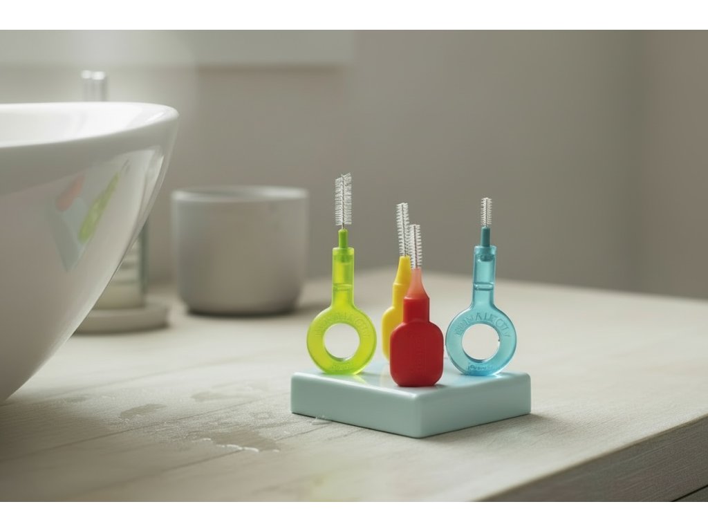 Stojánek pro Vaše mezizubní pomůcky. Můžete umístit až 4 mezizubní kartáčky všech značek i velikostí.