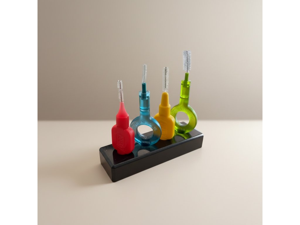 Stojánek pro Vaše mezizubní pomůcky. Můžete umístit až 4 mezizubní kartáčky všech značek i velikostí.