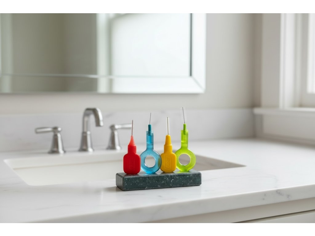 Stojánek pro Vaše mezizubní pomůcky. Můžete umístit až 4 mezizubní kartáčky všech značek i velikostí.