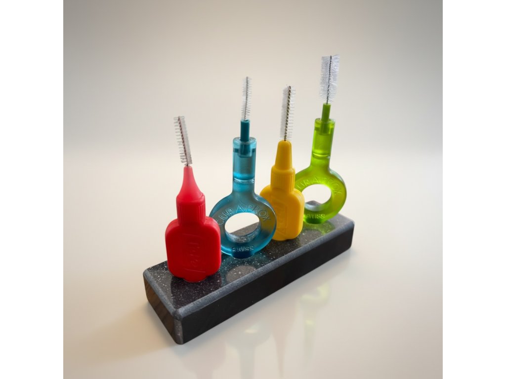 Stojánek pro Vaše mezizubní pomůcky. Můžete umístit až 4 mezizubní kartáčky všech značek i velikostí.
