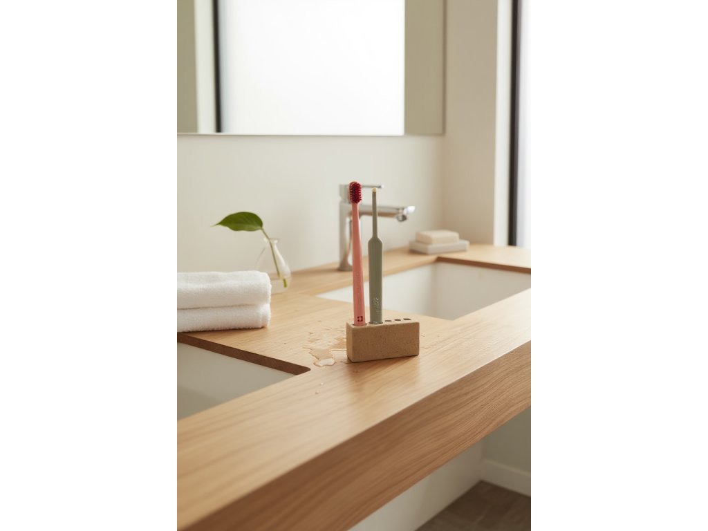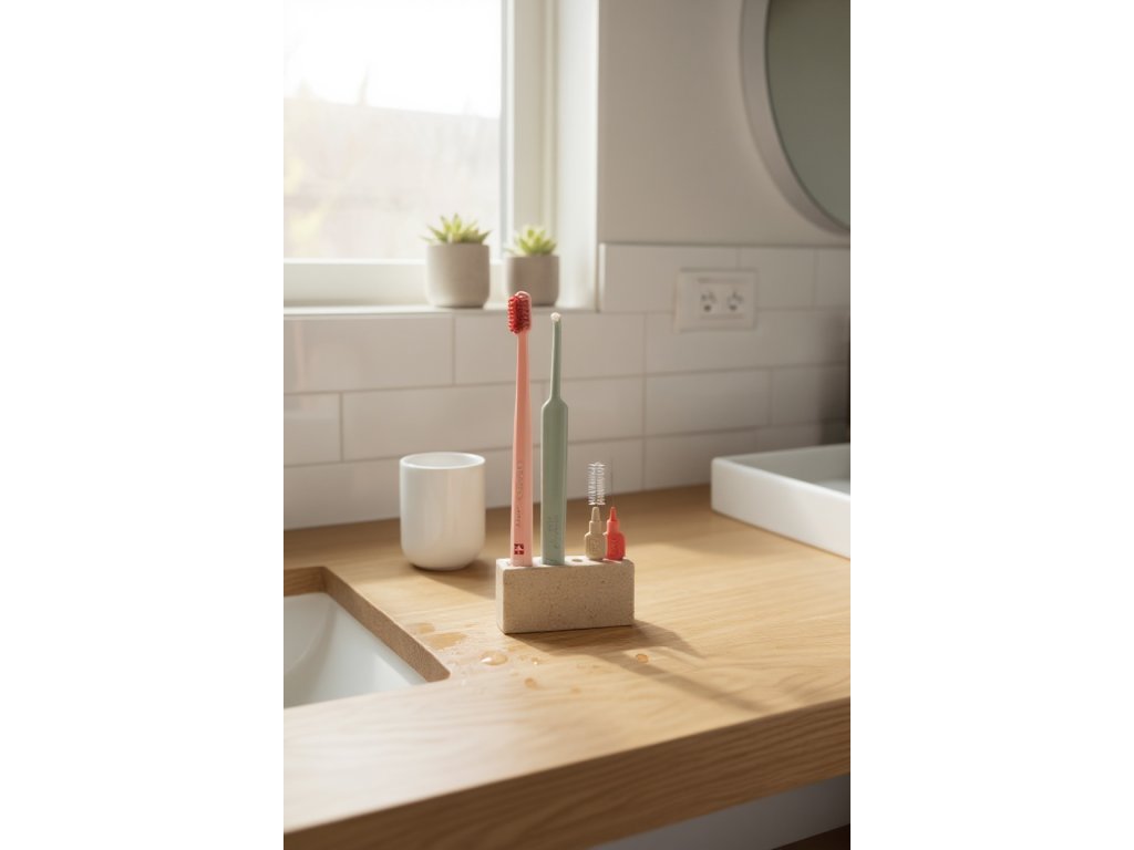 Stojánek pro vloení klasického zubního kartáku, hlavice elektrického kartáčku, jednosvazkového kartáku a 3 mezizubních karták.