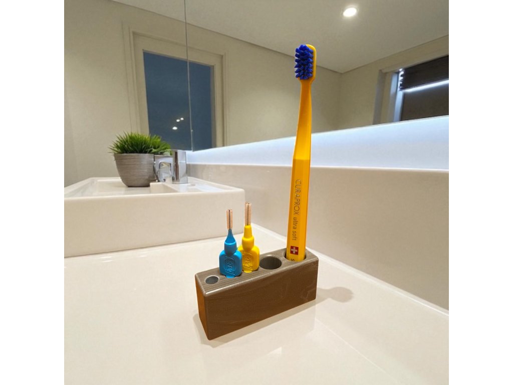 Stojánek pro vloení klasického zubního kartáku, hlavice elektrického kartáčku, jednosvazkového kartáku a 2 mezizubních karták.
