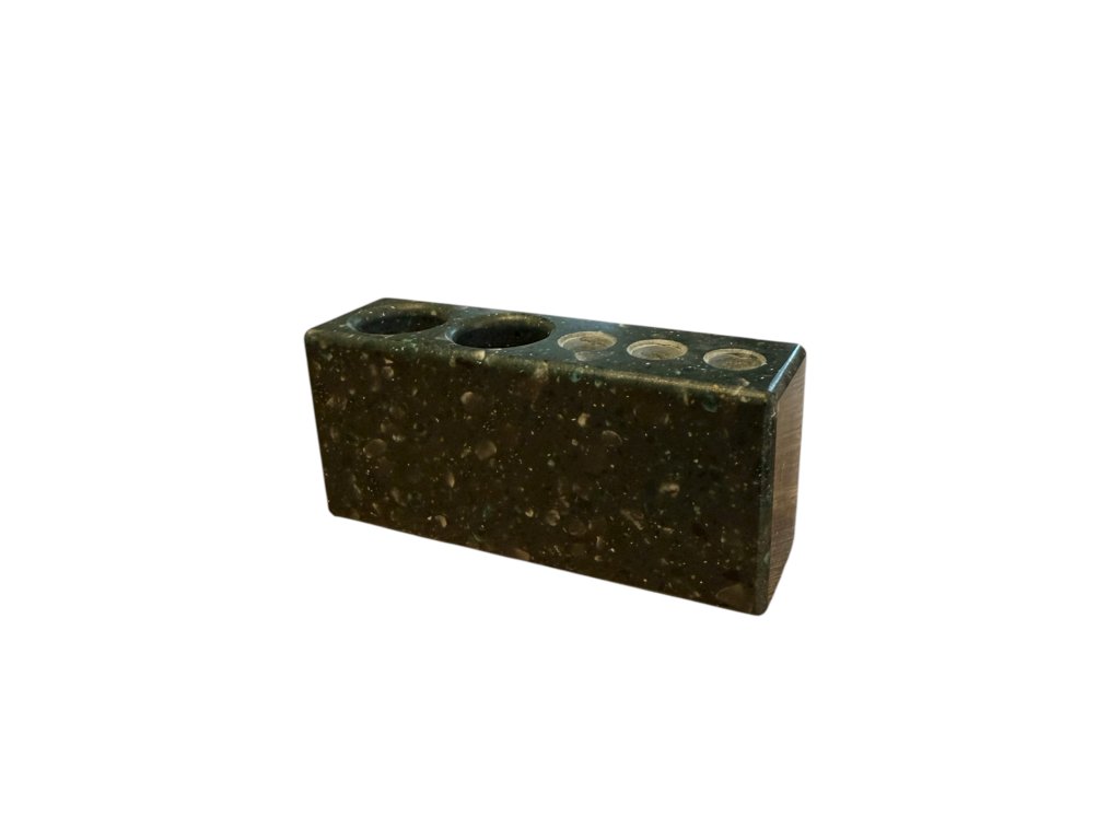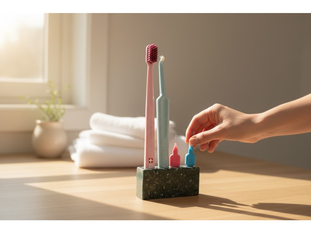 Stojánek pro vloení klasického zubního kartáku, hlavice elektrického kartáčku, jednosvazkového kartáku a 3 mezizubních karták.