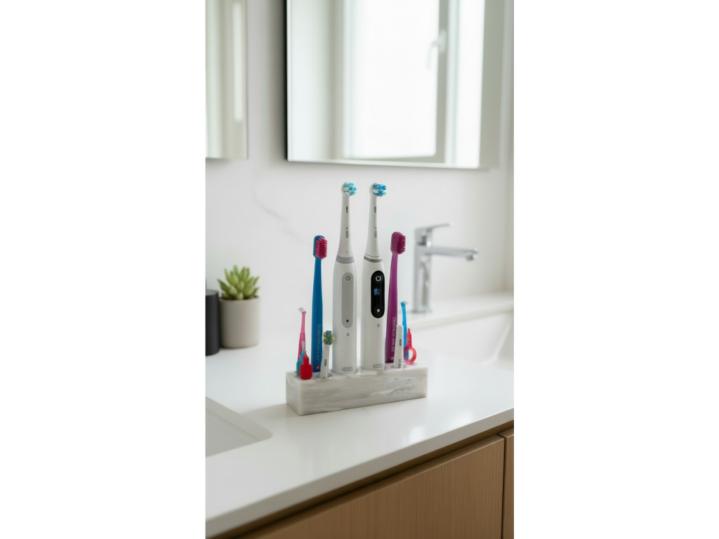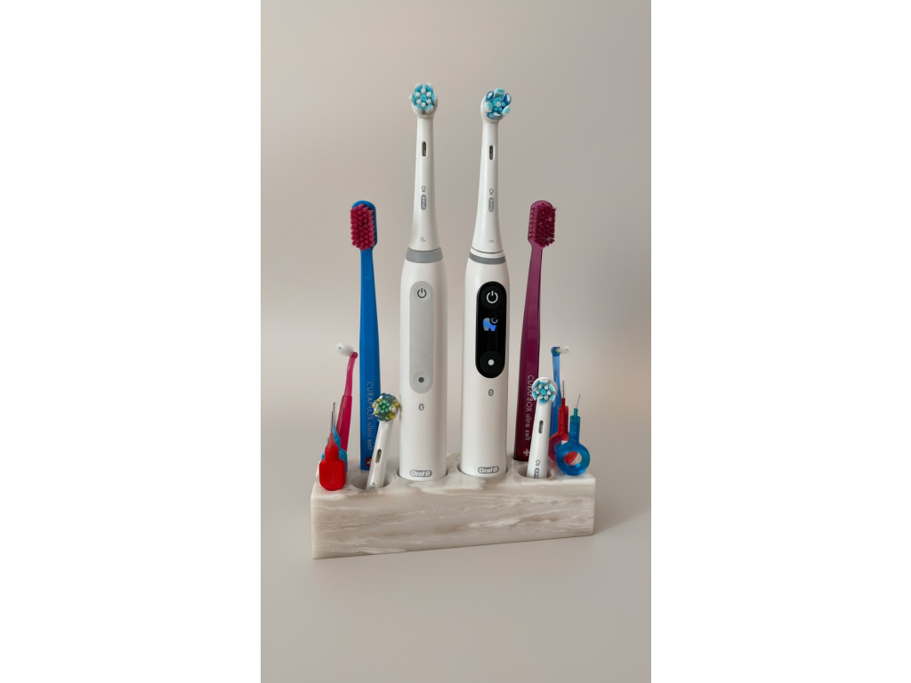 Stojánek Duo je navržený pro praktické a hygienické uložení dvou elektrických kartáčků Oral-B iO, jejich hlavic, klasických nebo jednosvazkových kartáčků a mezizubních kartáčků.