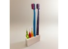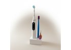 Stojánek pro vložení klasického zubního kartáčku, hlavice elektrického kartáčku, jednosvazkového kartáčku a 2 mezizubních kartáčků.